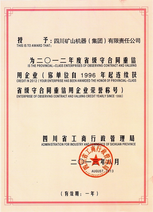 川礦集團公司日前,從省工商局獲悉,四川礦山機器(集團)有限責(zé)任公司喜獲“省級守合同重信用企業(yè)”稱號(公司自1996年起連續(xù)獲省級守合同重信用企業(yè)榮譽稱號),并頒發(fā)了榮譽證書。