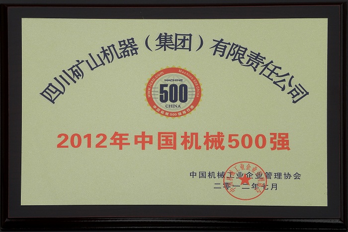 2012年,由中國機械工業(yè)企業(yè)管理協(xié)會主辦、機械工業(yè)經(jīng)濟管理研究院和世界經(jīng)理人集團聯(lián)合承辦的“中國機械500強”榜單上,四川礦山機器(集團)有限責任公司位列第400位。川礦集團作為省裝備制造業(yè)骨干企業(yè),將不斷夯實基礎,提高企業(yè)自主創(chuàng)新,提升質量管理和科技創(chuàng)新水平,為四川經(jīng)濟社會發(fā)展作出貢獻。