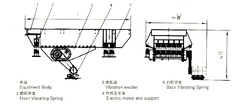振動(dòng)給料機(jī)是由給料槽體、激振器、彈簧支座、傳動(dòng)裝置等組成。槽體振動(dòng)給料的振動(dòng)源是激振器,激振器是由兩根偏心軸(主、被動(dòng))和齒輪副組成,由電動(dòng)機(jī)通過三角帶驅(qū)動(dòng)主動(dòng)軸,再由主動(dòng)軸上齒輪嚙合被動(dòng)軸轉(zhuǎn)動(dòng),主、被動(dòng)軸同時(shí)反向旋轉(zhuǎn),使槽體振動(dòng),使物料連續(xù)不斷流動(dòng),達(dá)到輸送物料的目的。