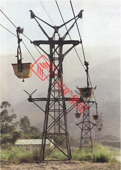 3、單線固定循環(huán)式索道系統(tǒng):吊桶固定在單一鋼索(兼負(fù)支、曳索功能)上,線上及站內(nèi)均以固定速率循環(huán)運行。
